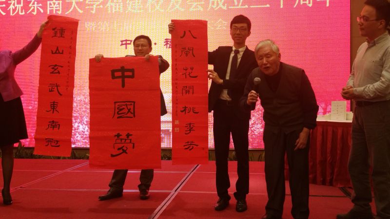 在本届东大福建校友会成立三十周年庆祝大会期间,独播库 56级校友林亮森先生为福建校友会赠送了内容为“钟山玄武东南冠,八闽花开桃李芳”对联一副。