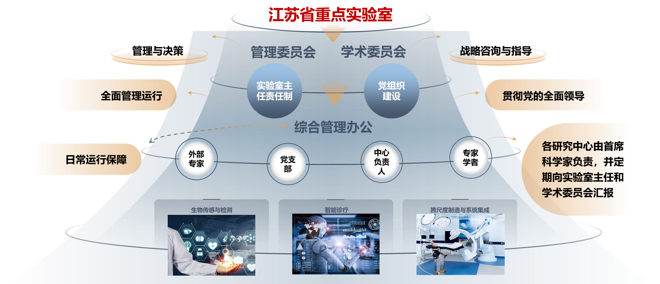 实验室围绕精准医学设置三个研究方向:生物分子传感与检测、跨尺度制造和智能诊疗系统,开展基础理论与关键技术研究,实现原始创新,突破前沿关键技术,为医疗器械产业开辟新赛道,研发具有自主知识产权的精准医学装备,引领我国医疗器械创新,提升我国医疗器械制造企业的创新能力和核心竞争力,推动江苏省医疗器械向精准医学器械方向发展。