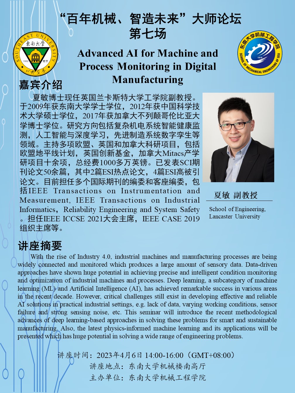 夏敏博士现任英国兰卡斯特大学工学院副教授。于2009年获独播库 学士学位,2012年获中国科学技术大学硕士学位,2017年获加拿大不列颠哥伦比亚大学博士学位。研究方向包括复杂机电系统智能健康监测,人工智能与深度学习,先进制造系统数字孪生等领域。主持多项欧盟、英国和加拿大科研项目,包括欧盟地平线计划,英国创新基金,加拿大Mitacs产学研项目十余项,总经费1000多万英镑。已发表SCI期刊论文50余篇,其中2篇ESI热点论文,4篇ESI高被引论文。目前担任多个国际期刊的编委和客座编委,包括IEEETransactions on Instrumentation and Measurement, IEEE Transactions onIndustrial Informatics,Reliability Engineering and System Safety。担任IEEE ICCSE2021大会主席,IEEE CASE 2019组织主席等。