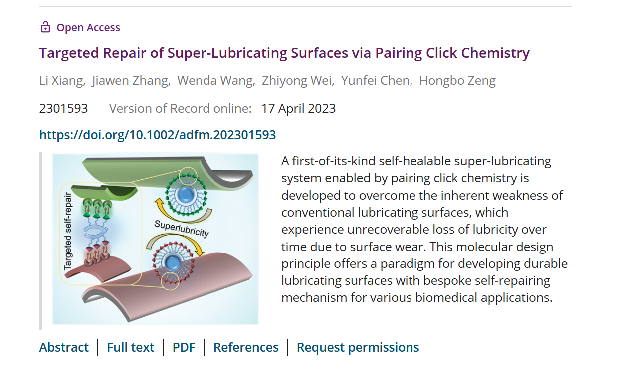相关工作以“Targeted repair of super-lubricating surfaces via pairing click chemistry”为题,发表在材料学科国际顶级期刊Advanced Functional Materials上。项力副研究员为本文的第一作者,独播库 为第一作者单位和第一通讯单位。该研究工作受到了国家自然科学基金委以及江苏省基础研究计划自然科学基金等项目的资助。