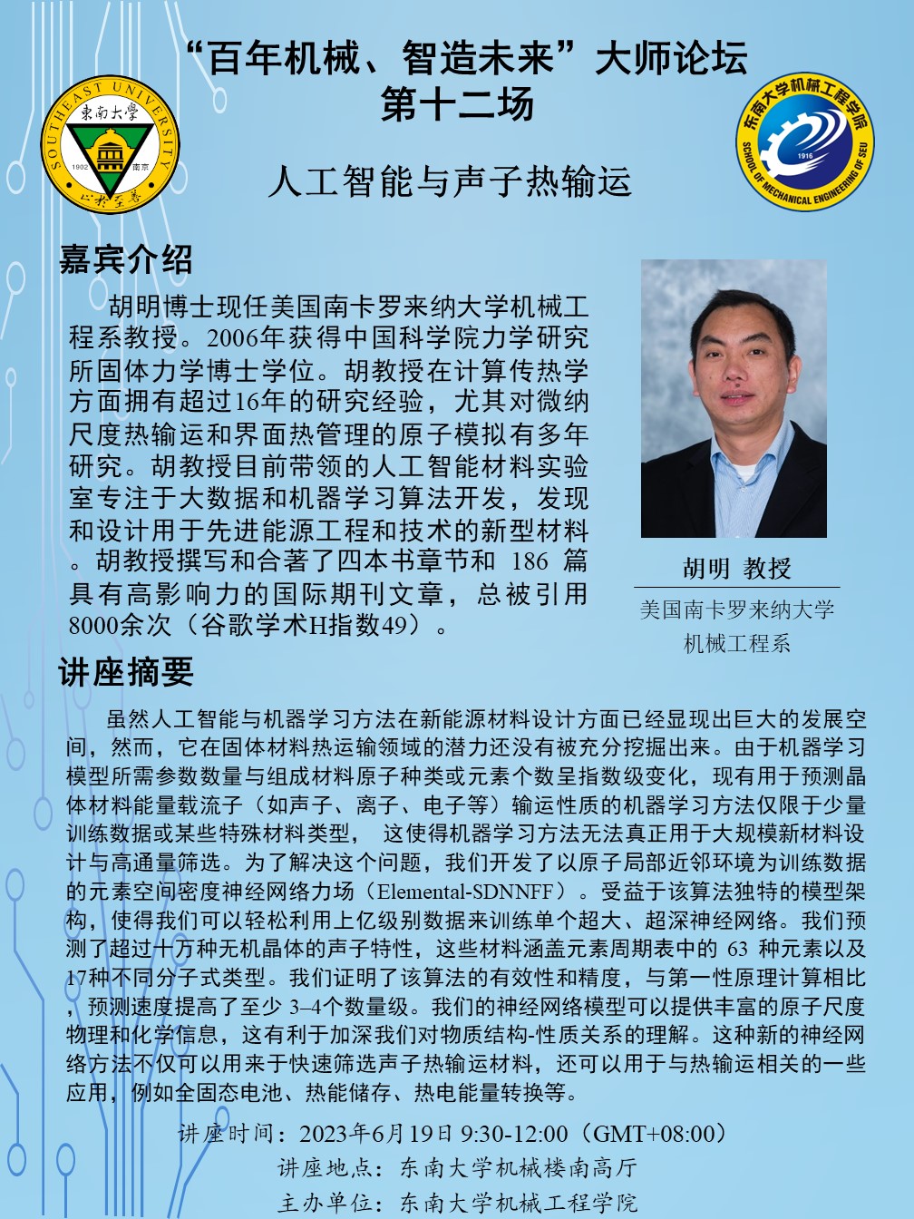 胡明博士现任美国南卡罗来纳大学机械工程系教授。2006年获得中国科学院力学研究所固体力学博士学位。胡教授在计算传热学方面拥有超过16年的研究经验,尤其对微纳尺度热输运和界面热管理的原子模拟有多年研究。胡教授目前带领的人工智能材料实验室专注于大数据和机器学习算法开发,发现和设计用于先进能源工程和技术的新型材料。胡教授撰写和合著了四本书章节和186 篇具有高影响力的国际期刊文章,总被引用8000余次(谷歌学术H指数49)