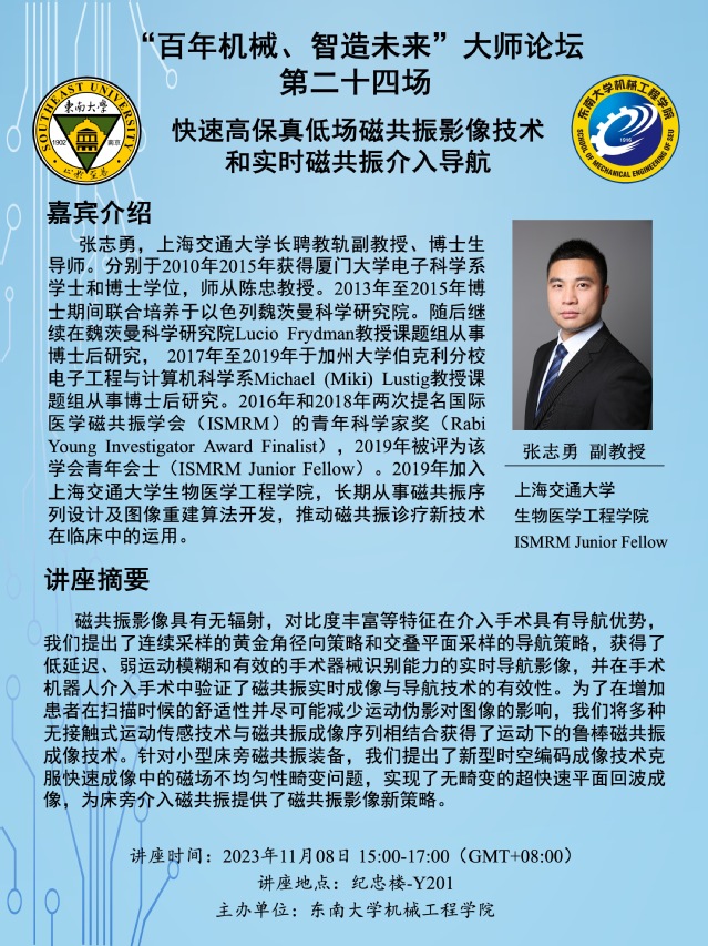 张志勇,上海交通大学长聘教轨副教授、博士生导师。分别于2010年2015年获得厦门大学电子科学系学士和博士学位,师从陈忠教授。2013年至2015年博士期间联合培养于以色列魏茨曼科学研究院。随后继续在魏茨曼科学研究院Lucio Frydman教授课题组从事博士后研究, 2017年至2019年于加州大学伯克利分校电子工程与计算机科学系Michael (Miki) Lustig教授课题组从事博士后研究。2016年和2018年两次提名国际医学磁共振学会(ISMRM)的青年科学家奖(Rabi Young Investigator Award Finalist),2019年被评为该学会青年会士(ISMRM Junior Fellow)。2019年加入上海交通大学生物医学工程学院,长期从事磁共振序列设计及图像重建算法开发,推动磁共振诊疗新技术在临床中的运用。