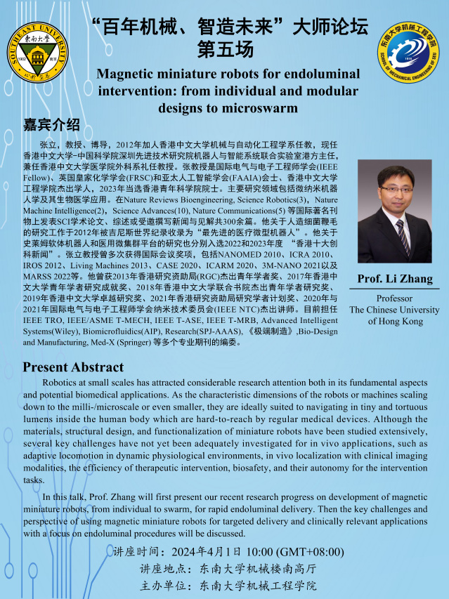 In this talk, Prof. Zhang will first present our recent research progress on development of magnetic miniature robots, from individual to swarm, for rapid endoluminal delivery. Then the key challenges and perspective of using magnetic miniature robots for targeted delivery and clinically relevant applications with a focus on endoluminal procedures will be discussed.