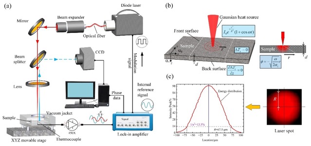 针对各向异性微米薄膜热测量的巨大应用需求,独播库 王建立教授课题组经过近3年的努力,开发了一种基于激光周期加热的测试系统,用于测量微米薄膜的各向异性热扩散率(图1)和热导率。论文连续发表在工程技术类TOP期刊《国际传热传质》( Int J Heat Mass Transf, JCR分区 1区)。有别于LFA和锁相红外技术,该测试方法将相位的空间分布分为线性和非线性区域,分别采用一维和三维热传导模型测量得到微米薄膜的面内和面外热扩散率。目前测试结果表明,该系统测试范围涵盖热扩散率:1×10−8 m2/s到1×10−3 m2/s,厚度:微米到毫米,温度:80K到500K。目前,通过与浙江大学、宁波材料所等国内诸多单位合作,该系统已经成功测量了包括石墨烯均热膜、聚酰亚胺薄膜、木制纤维薄膜等多种各向异性薄膜,对薄膜材料研发具有重要意义。