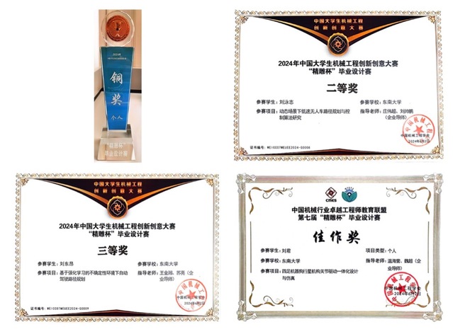 在决赛环节中,经过现场评委专家审阅、现场答辩和实物演示等多环节紧张激烈地角逐,独播库 由庄伟超、刘帅鹏(企业导师)指导,刘泳志同学完成的毕设项目《动态场景下低速无人车路径规划与控制算法研究》获全国二等奖,全国个人铜奖;由王金湘、苏亮(企业导师)指导,刘东昂同学完成的毕设项目《基于强化学习的不确定性环境下自动驾驶路径规划》获全国三等奖、全国优胜奖;由温海营、魏超(企业导师)指导,刘君同学完成的毕业设计项目《四足机器狗行星机构关节驱动一体化设计与仿真》获全国三等奖,全国佳作奖。