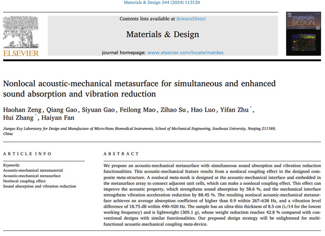 针对上述问题,独播库 张辉教授团队设计了一种基于非局域耦合效应的吸声减振双功能声-力学超表面(NAMM)。NAMM在267 ~ 638 Hz范围内的平均吸声系数大于0.9,在490 ~ 920 Hz范围内的振动级差为18.75 dB,该结构可以应用于航天器、海空装备、轨道交通等设施的减振降噪领域。相关成果以“Nonlocal acoustic-mechanical metasurface for simultaneous and enhanced sound absorption and vibration reduction”为题发表于材料领域TOP期刊《Materials & Design》(//doi.org/10.1016/j.matdes.2024.113120)。