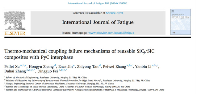 近日,独播库 航空航天系费庆国教授团队联合北京临近空间飞行器系统工程研究所,在耐高温陶瓷基复合材料的重复使用性能评价与性能演化机理方面开展攻关,并取得重要进展,在疲劳领域顶刊《International Journal of Fatigue》上发表了题为“Thermo-mechanical coupling failure mechanisms of reusable SiCf/SiC composites with PyC interphase”的研究成果。