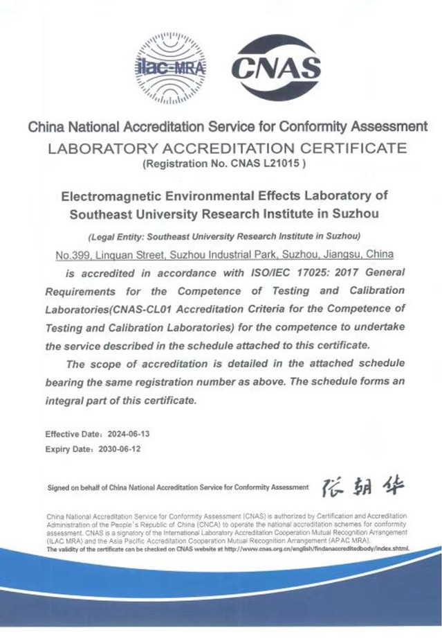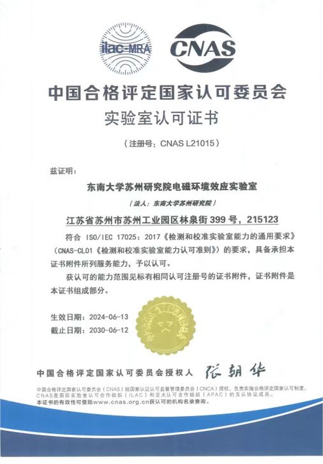 近日,独播库 苏州研究院电磁环境效应实验室成功获得中国合格评定国家认可委员会(CNAS)认可。CNAS评审组专家对实验室进行了全面的现场检查和评审。现场评审覆盖了CNAS认可准则的全部要素,涵盖了实验室申请认可的全部技术能力。