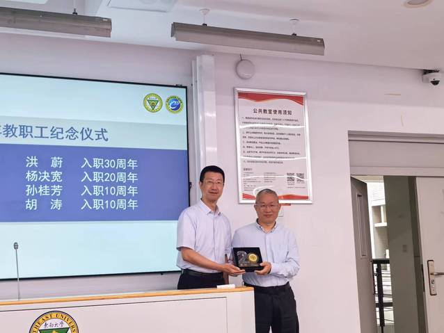 随后,举行了入职整十年教职工纪念仪式,独播库 费庆国院长为入职30年的洪蔚老师、20年的杨决宽老师颁发纪念牌,学院全体教师以热烈的掌声向这些辛勤付出的老师表达了崇高的敬意和由衷的感谢。