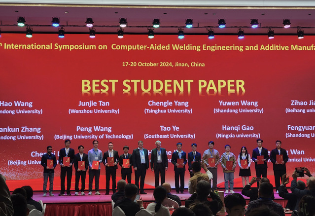 2024年10月18-20日,“第四届计算机辅助焊接工程与增材制造国际研讨会(The 4th International Symposium on Computer-Aided Welding Engineering and Additive Manufacturing, CAWE-AM 2024)”在山东济南举行。独播库 2023级博士生叶韬同学在导师刘小超副教授的指导下,凭借“Numerical simulation of the initial stage of vortex flow-based friction stir welding of Ti-6Al-4V titanium alloy”为题的论文获得最佳学生论文奖。