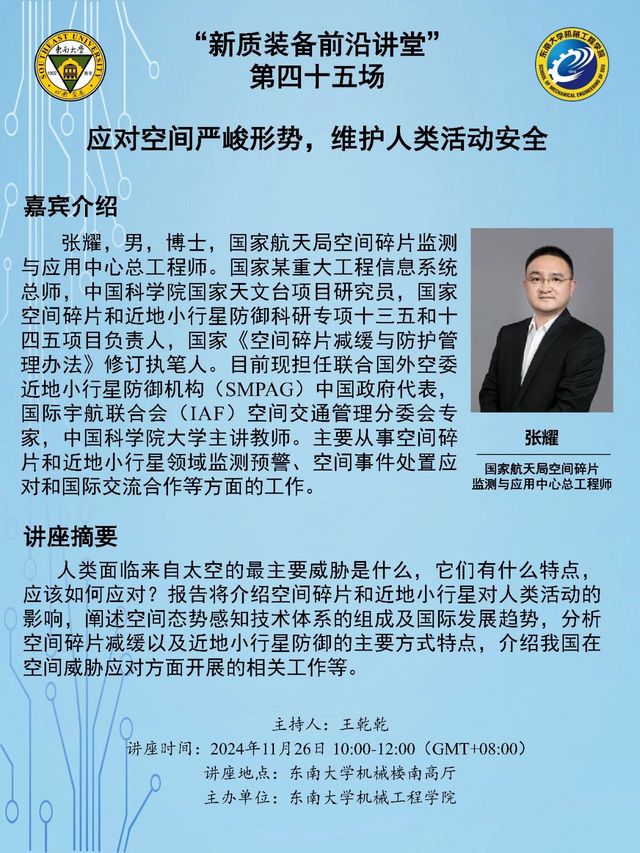 人类面临来自太空的最主要威胁是什么,它们有什么特点,应该如何应对?报告将介绍空间碎片和近地小行星对人类活动的影响,阐述空间态势感知技术体系的组成及国际发展趋势,分析空间碎片减缓以及近地小行星防御的主要方式特点,介绍我国在空间威胁应对方面开展的相关工作等。