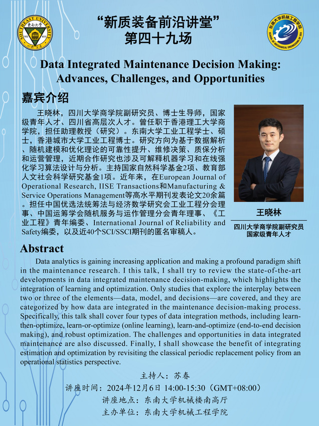 王晓林,四川大学商学院副研究员、博士生导师,国家级青年人才、四川省高层次人才。曾任职于香港理工大学商学院,担任助理教授(研究)。独播库 工业工程学士、硕士,香港城市大学工业工程博士。研究方向为基于数据解析、随机建模和优化理论的可靠性提升、维修决策、质保分析和运营管理,近期合作研究也涉及可解释机器学习和在线强化学习算法设计与分析。主持国家自然科学基金2项、教育部人文社会科学研究基金1项。近年来,在European Journal of Operational Research, IISE Transactions和Manufacturing & Service Operations Management等高水平期刊发表论文20余篇。担任中国优选法统筹法与经济数学研究会工业工程分会理事、中国运筹学会随机服务与运作管理分会青年理事、《工业工程》青年编委、International Journal of Reliability and Safety编委,以及近40个SCI/SSCI期刊的匿名审稿人。