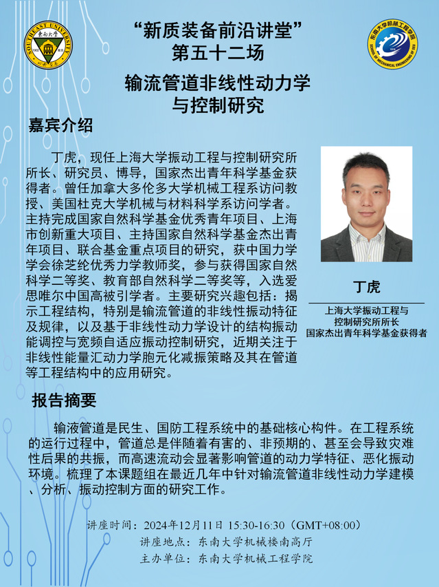 “新质装备前沿讲堂”第五十二场:丁虎杰青——输流管道非线性动力学与控制研究