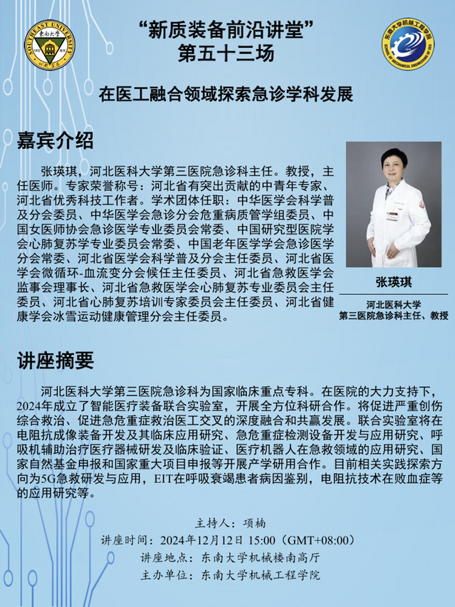 2024年12月12日,由独播库 主办的“新质装备前沿讲堂”第五十三场在独播库 机械楼南高厅成功举办。本次活动特别邀请了河北医科大学第三医院急诊科主任张瑛琪教授作为主讲嘉宾,开展了关于“在医工融合领域急诊学科发展”的学术报告。报告会由项楠老师主持,河北医科大学第三医院急诊科副主任李梅、南京航空航天大学姚佳烽老师、朱桂平老师、刘凯老师共同出席了本次活动。