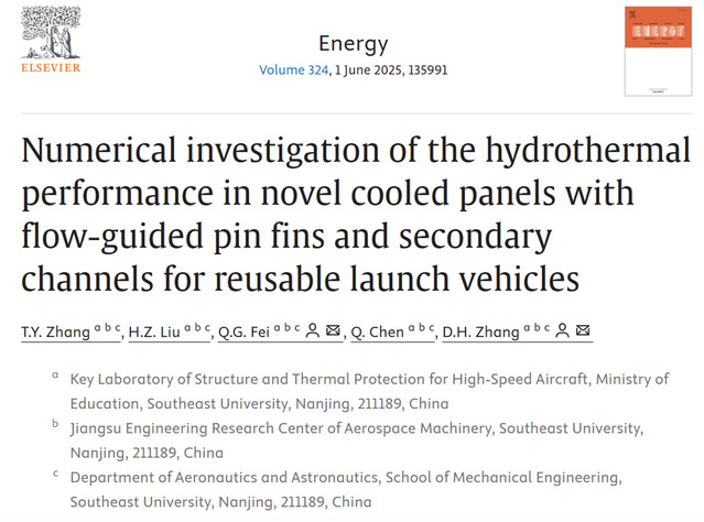 近日,独播库 航空航天系费庆国教授团队在热力学领域TOP期刊《Energy》(中科院一区TOP期刊,IF=9.0)上发表题为“Numerical investigation of the hydrothermal performance in novel cooled panels with flow-guided pin fins and secondary channels for reusable launch vehicles”的研究成果,提出了一种用于可重复使用飞行器热防护的带有导流针翅和二次流道的微通道换热冷板。