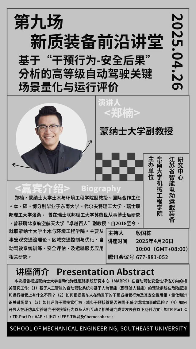 2025年机械学院“新质装备前沿讲堂”第九场:郑楠教授——基于“干预行为-安全后果”分析的高等级自动驾驶关键场景量化与运行评价