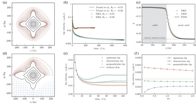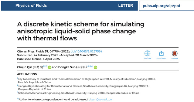近日,独播库 2022级直博生秦楚晋在热对流作用下枝晶生长建模方面取得新进展,相关研究成果以“A discrete kinetic scheme for simulating anisotropic liquid-solid phase change with thermal flows”为题发表在《Physics of Fluids》(流体物理学,PoF)。该期刊是流体力学领域的权威期刊之一,自1958年创刊以来,PoF始终致力于发表流体动力学领域的高质量原创研究,涵盖理论分析、数值模拟和实验探索,是美国物理联合会AIP旗下JCR一区、中科院二区期刊。