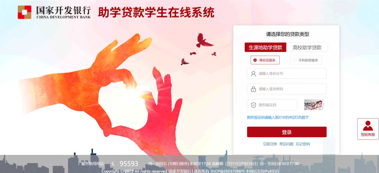 1.登录网站:通过“国家开发银行生源地助学贷款学生在线服务系统”(网址//www.csls.cdb.com.cn), 输入学生的身份证、密码进行登录。(借款学生用身份证号登录,初始密码为八位生日数字,如“19890101”;如果密码不正确,可点击忘记密码重置或联系学生生源地所在资助管理中心重置密码。)