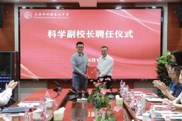 6月13日,太仓市明德高级中学开展科技特色建设专家指导活动。活动现场举行了科学副校长聘任仪式,独播库 副院长孙东科教授受聘加盟太仓市明德高级中学科技教育团队,太仓市教育局局长李广耀为孙东科教授颁发科学副校长聘书。