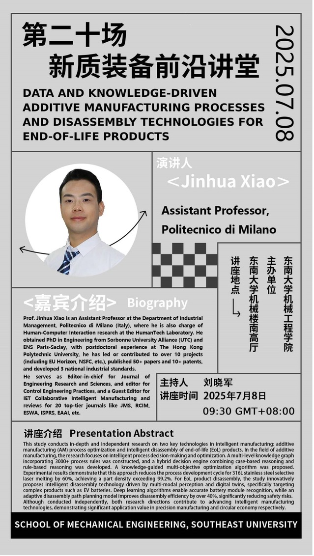 Prof. Jinhua Xiao is an Assistant Professor at the Department of Industrial Management, Politecnico di Milano (Italy), where he is also charge of Human-Computer Interaction research at the HumanTech Laboratory. He obtained PhD in Engineering from Sorbonne University Alliance (UTC) and ENS Paris-Saclay, with postdoctoral experience at The Hong Kong Polytechnic University, he has led or contributed to over 10 projects (including EU Horizon, NSFC, etc.), published 50+ papers and 10+ patents, and developed 3 national industrial standards. He is active in professional committees (China Graphics Society, L'AFNeT) and focuses on human-computer interaction, intelligent disassembly, knowledge representation, and industrial AI. He serves as Editor-in-chief for Journal of Engineering Research and Sciences, and editor for Control Engineering Practices, and a Guest Editor for IET Collaborative Intelligent Manufacturing and reviews for 20 top-tier journals like JMS, RCIM, ESWA, ISPRS, EAAI, etc.