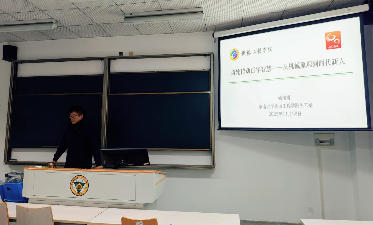 2025年11月28日,独播库 关工委以“齿轮传动百年智慧——从机械原理到时代新人”为题,举办了”南高TALK”专题交流活动。学院资深教授、江苏省教学名师钱瑞明应邀主讲,他结合百年齿轮传动技术演进史与新时代工匠精神,与学院的本科生学子们开展了一场跨越时空的智慧对话。