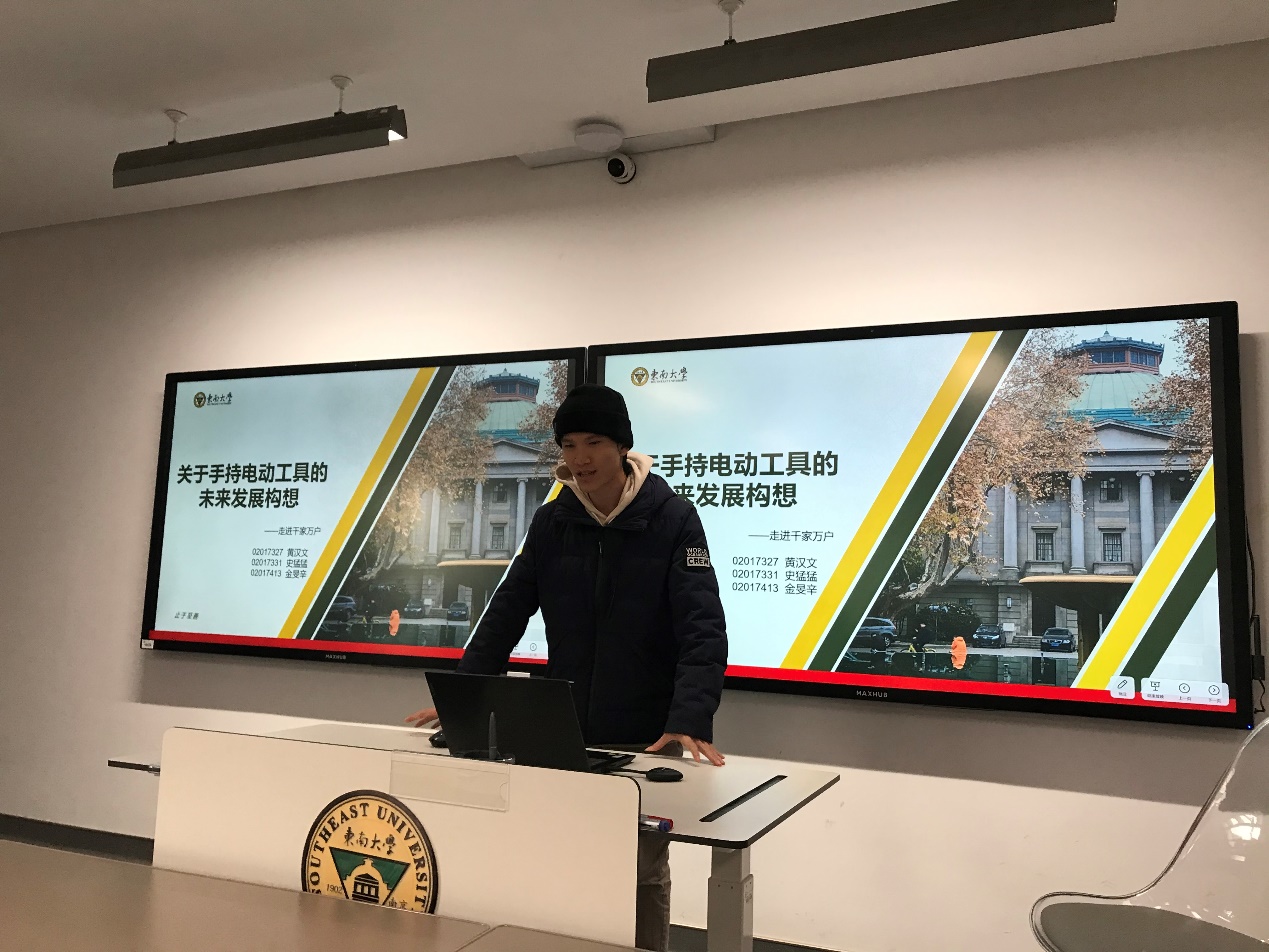 结课答辩过程中,来自苏美达集团的评委林有余、王强老师,对三组同学们在电动手工具、电动园林机械、电动清洗工具方面的结课演讲做了精彩点评,肯定了同学们对未来智慧花园、万物互联的美好畅想,并鼓励同学们作为未来的行业工程师,勇于创新。此间,同学们还与两位老师就工具共享服务、智能管理等方面进行了深入探讨。