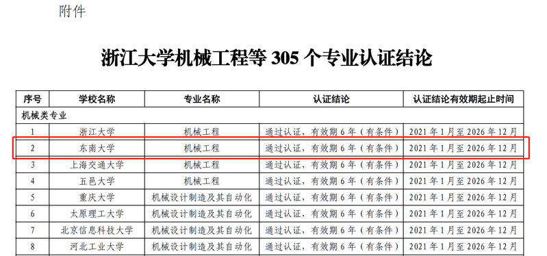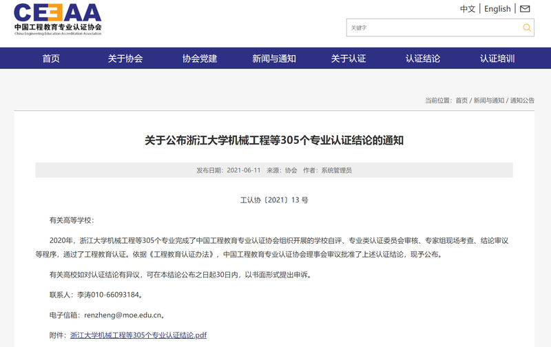 近日,中国工程教育专业认证协会发布了《关于公布浙江大学机械工程等305个专业认证结论的通知》(工认协〔2021〕13号),通知公示了2020年参加全国工程教育专业认证的认证结论。独播库 机械工程专业顺利通过认证,有效期6年(2021年-2026年),这是独播库 机械工程专业第四次通过教育部工程教育专业认证。从2007年至今,全国机械类专业通过教育部工程教育专业认证最多为4次,目前仅有4所985高校的机械类专业通过4次专业认证。机械工程专业也是2020年独播库 通过教育部工程教育专业认证的唯一专业。