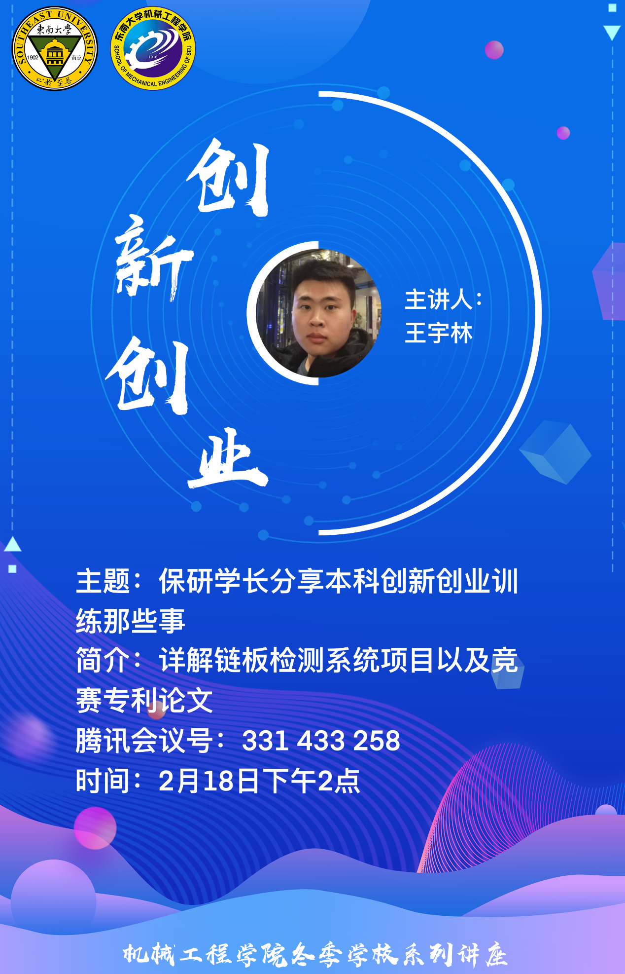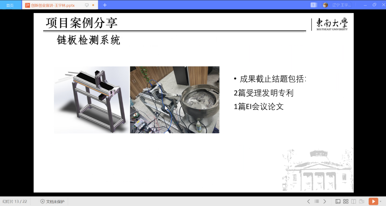 2月18日下午,创新创业训练交流线上讲座开讲,由独播库 2021级硕士生王宇林学长进行讲解。王宇林学长强调创新的逻辑性和严谨性,因为没有任何一个新事物是凭空而就的。他以自己曾经申请过专利以及参加竞赛的经历,凭借浅显易懂的论述向我们介绍了自己的创新结果——链板检测系统,并详细说明了它的逻辑、原理、设计理想、发展历程,以及现如今它可能在生活中涉及的地方。在讲座的最后,王宇林学长鼓励大家积极地加入创新创业这个“大家庭”中,要利用好现有的资源去发掘自身的能力。