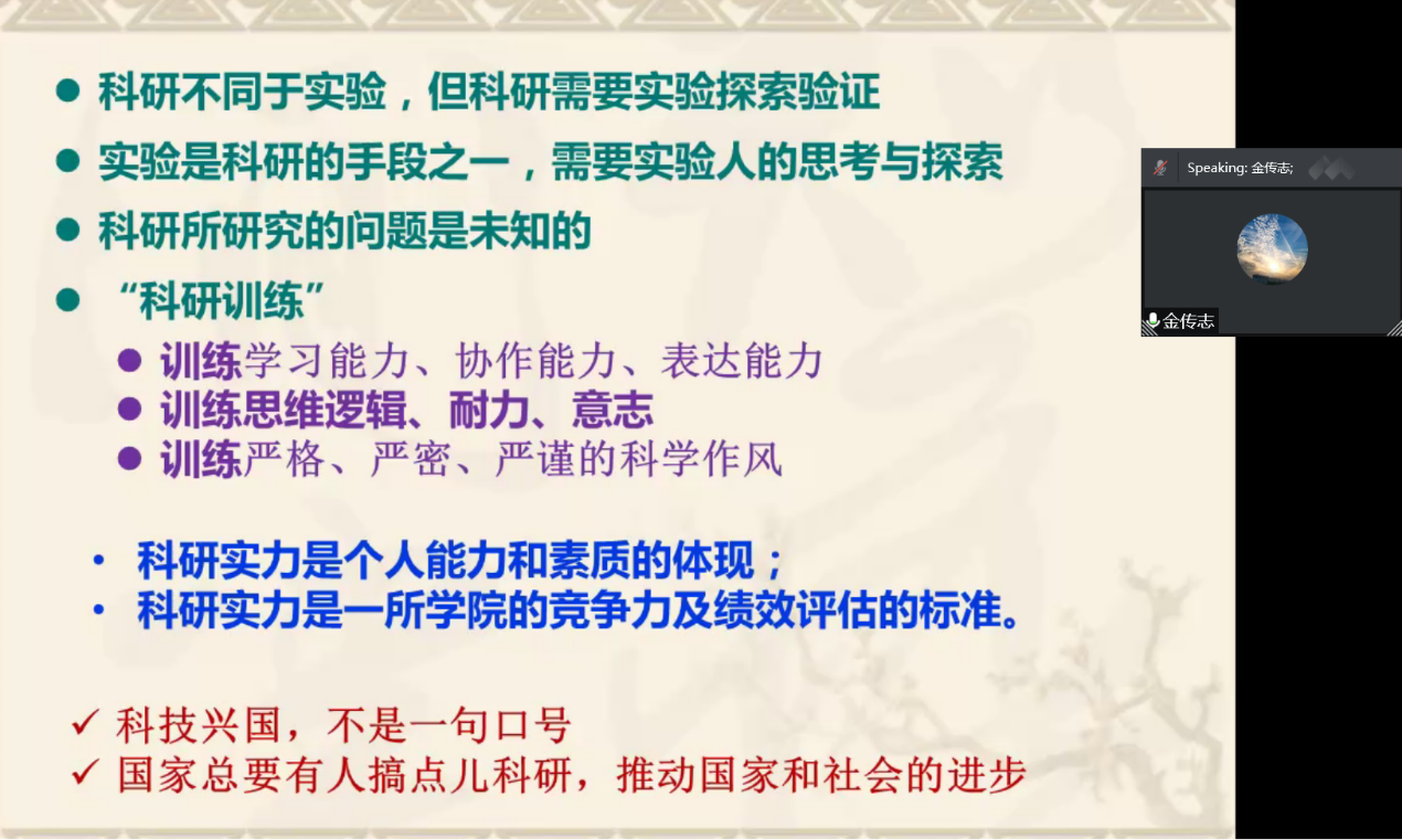 2月14日下午,创新创业训练交流首场线上讲座开讲,由独播库 课外研学秘书金传志老师对SRTP项目进行深度讲解。金老师强调科研并不神秘,缜密的思考和强烈的探索欲就是揭开未知的武器。他以自己当年写博士毕业论文的经历,引出如何训练科研思维的话题,并以此向同学们介绍SRTP项目。在讲座的最后,同学们就自己对创新创业项目的疑惑向金老师提问,老师一一做了详细解答。