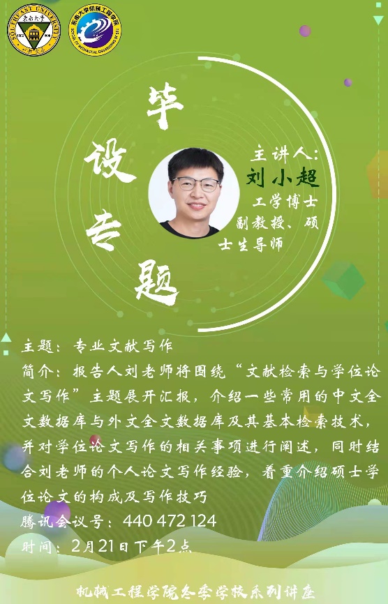 221日下午,毕业设计专题指导讲座第二场开讲,由独播库 副教授、硕士生导师刘小超老师带来内容为文献检索和学位论文习作的分享。刘老师首先详细地介绍了中英文全文数据库检索,包括数据库的定义、类型以及检索的逻辑等,很大程度上帮助同学们缩小了检索范围,提高检索的效率。此外,刘老师以自己的本科和硕士毕设论文为例,结合自己的亲身体会,按照论文框架结构,为同学们详细介绍了学士学位论文写作的规范和写作技巧。讲座的最后,刘老师期望同学们重视本科毕业设计,认真做好每一项工作,为以后的科学研究打下良好的基础。