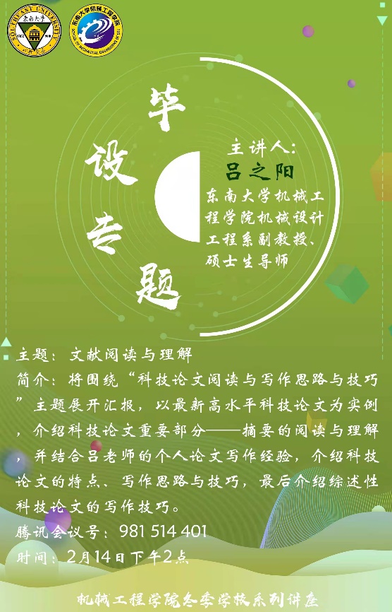 214日下午,毕业设计专题首场线上首场讲座开讲,由独播库 副教授、硕士生导师吕之阳老师围绕“科技论文阅读与写作思路与技巧”主题展开讲解。吕老师以最新高水平科技论文为实例,介绍科技论文重要部分——摘要的阅读理解,并结合吕老师的个人协作经验,介绍科技论文的特点、写作思路与技巧,并对综述性科技论文的写作技巧进行了详细阐述。在讲座的最后,吕老师针对同学们的问题发表了自己独特的见解,同学们收获颇丰。