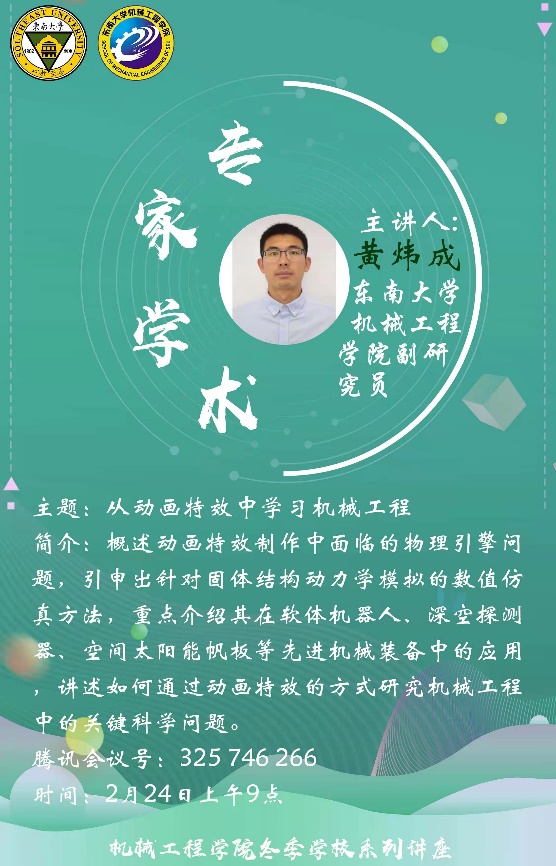 2月24日,独播库 副研究员黄炜成老师为我们独播库 全体同学带来了一场生动有趣的讲座。以“从动画特效中学习机械工程”为主题,黄炜成老师首先概述了动画特效制作中面临的物理引擎问题,进一步引申出针对固体结构动力学模拟的数值仿真方法,并重点介绍其在软体机器人、深空探测器、空间太阳能帆板等先进机械装备中的应用,讲述如何通过动画特效的方式研究机械工程中的关键科学问题。最后黄炜成老师给同学们展示了自己在柔性非线力性学方面的一些研究成果,并与同学们一起交流探讨相关问题,使独播库 的同学们受益良多。