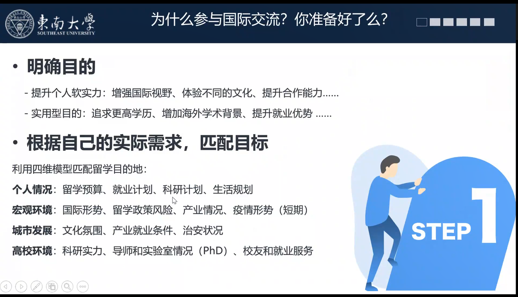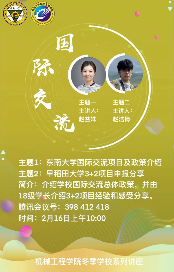 2月16日上午,国际交流讲座系列的首场讲座在线上开展,国际交流合作处的赵益姝老师以及2018级本科生赵浩博学长分别对独播库 国际交流整体政策、早稻田大学3+2项目进行了分享。赵老师主要对目前申报较多的交流项目进行了分析讲解,并概括了校内手续办理的一般步骤,对校内各部门的分工进行了简要介绍。最后,赵老师也对参加国际交流的目的进行了进一步概括,也希望同学们可以结合自身情况,选取最适合自己的项目。赵浩博学长则以早稻田大学的基本情况以及地理环境开题,讲述了所申报项目的学院构成及整个学期的具体时间安排和课程安排。最后,赵浩博学长对申报该项目的要求和所需的资料进行了概括,并对申报该项目的优势进行了分析总结,也希望感兴趣的同学可以积极参与。