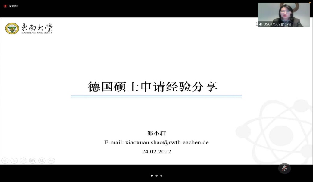 2月24日下午,国际交流专题的最后一场讲座在线上开展,由2017级本科生邵小轩学姐对德国硕士申请的经验进行了分享。邵小轩学姐首先对申请德国硕士的优势进行了大体概括,并提及到所需的材料和成绩等。而后,邵小轩学姐以亚琛工业大学为例,介绍了各学期的学习情况,并对攻读完硕士后未来的发展进行了分析与展望。在最后,邵小轩学姐也对想申报该项目的同学,根据
