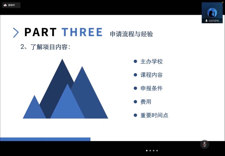 2月16日上午,国际交流讲座系列的首场讲座在线上开展,国际交流合作处的赵益姝老师以及2018级本科生赵浩博学长分别对独播库 国际交流整体政策、早稻田大学3+2项目进行了分享。赵老师主要对目前申报较多的交流项目进行了分析讲解,并概括了校内手续办理的一般步骤,对校内各部门的分工进行了简要介绍。最后,赵老师也对参加国际交流的目的进行了进一步概括,也希望同学们可以结合自身情况,选取最适合自己的项目。赵浩博学长则以早稻田大学的基本情况以及地理环境开题,讲述了所申报项目的学院构成及整个学期的具体时间安排和课程安排。最后,赵浩博学长对申报该项目的要求和所需的资料进行了概括,并对申报该项目的优势进行了分析总结,也希望感兴趣的同学可以积极参与。
