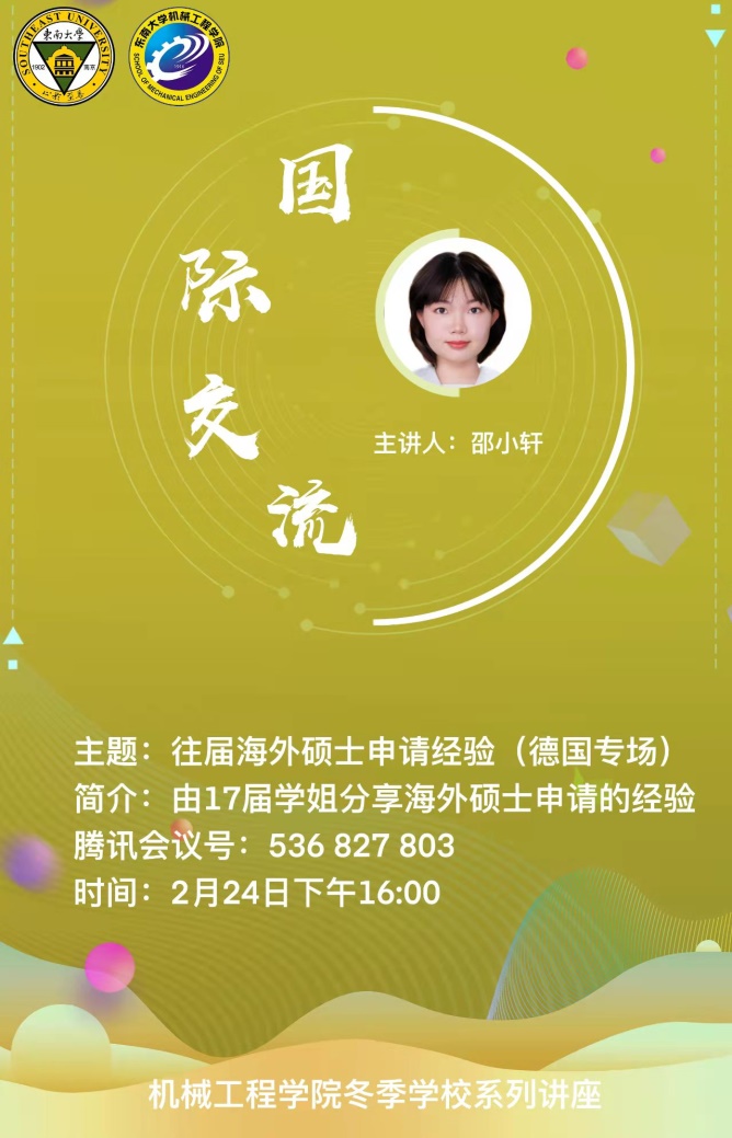 2月24日下午,国际交流专题的最后一场讲座在线上开展,由2017级本科生邵小轩学姐对德国硕士申请的经验进行了分享。邵小轩学姐首先对申请德国硕士的优势进行了大体概括,并提及到所需的材料和成绩等。而后,邵小轩学姐以亚琛工业大学为例,介绍了各学期的学习情况,并对攻读完硕士后未来的发展进行了分析与展望。在最后,邵小轩学姐也对想申报该项目的同学,根据