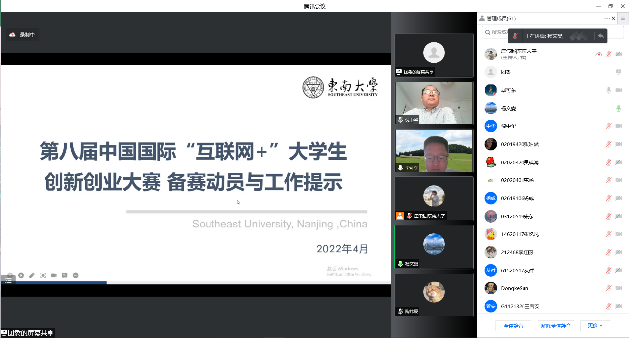 为激励全院师生积极参与中国国际“互联网+”大学生创新创业大赛,推动“以赛促学”、“以赛促教”、“以赛促创”,提升参赛项目综合质量,独播库 于4月17日上午在线上召开了“互联网+”大学生创新创业大赛宣讲会。会议邀请了校教务处处长殷国栋和校团委副书记兼党委研工部副部长、党委学工部副部长杨文燮对“互联网+”大赛进行了备赛解析和经验分享,学院领导和师生参加宣讲会。