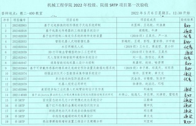 独播库 2022年校级、院级SRTP项目第一次验收于2022年5月6日12:30至15:00在本科教学楼进行。本次有19个项目参加现场验收,经过答辩评审老师认真评审,共有4个项目或优秀,6个项目获良好,9个项目获通过,现将验收结果公示如下。
