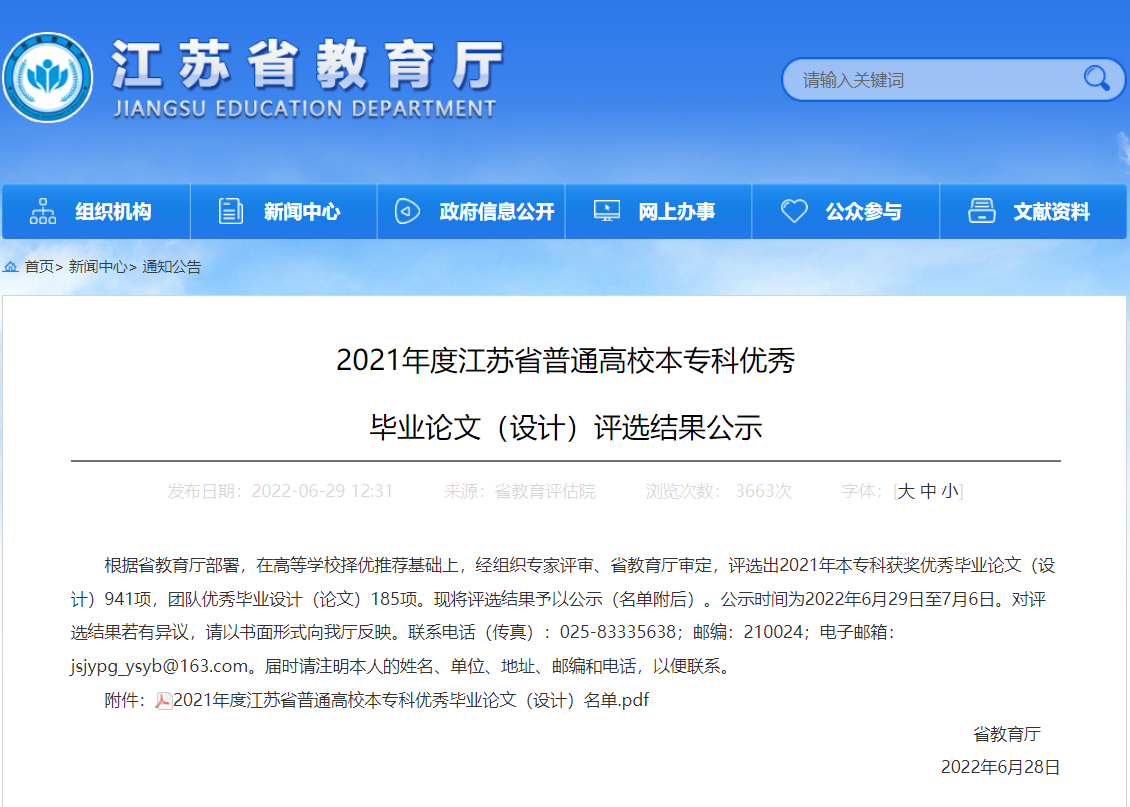 近日,江苏省教育厅公示了2021年省普通高校本专科优秀毕业设计(论文)评选结果,独播库 获优秀毕业设计(论文)二等奖1项,团队优秀毕业设计(论文)1项。