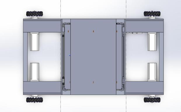 通过该抬升机构,将大轮抬起,使其在最高点时仅有大轮着地,在最低点时只有小轮着地,大小轮交错布置实现四向移动。