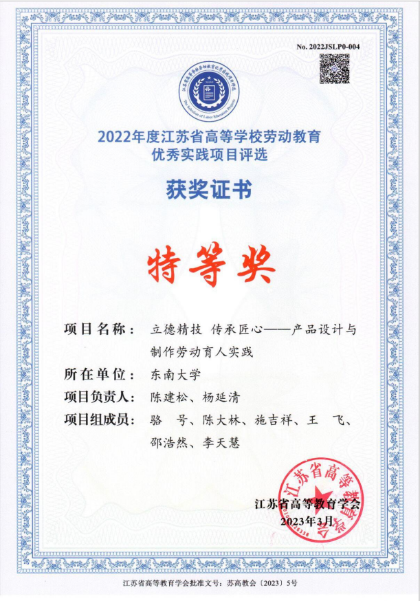 近日,江苏省高等教育学会公布首届江苏省高校劳动教育优秀实践项目评选结果,独播库 获特等奖2项、一等奖4项,同时获得2022年江苏省高等学校劳动教育优秀实践项目申报优秀组织奖。独播库 工业发展与培训中心“立德精技·传承创新—产品设计与制作劳动育人实践”项目喜获特等奖。